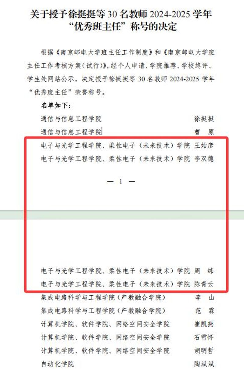 近日,南京郵電大學(xué)2024-2025學(xué)年“優(yōu)秀班主任”評選結(jié)果正式揭曉。全校共30位教師獲此殊榮,其中,電子與光學(xué)工程學(xué)院、柔性電子(未來技術(shù))學(xué)院共有四位教師光榮入選,分別是王始彥、李雙德、周緯、陳青云。本次評選注重學(xué)生的真實反饋,根據(jù)“學(xué)生評價情況”(即班主任工作測評分?jǐn)?shù))和班主任提交的各類履職材料,對各位班主任老師的履職情況進行綜合評定,最終擇優(yōu)入選。電光柔院此次能夠有四位教師脫穎而出,榮獲校級“優(yōu)秀班主任”稱號,是學(xué)校對學(xué)院班主任工作整體水平和育人實效的高度認可。入選老師在日常工作中,始終堅守育人初心,恪盡職守,在思想引領(lǐng)、學(xué)業(yè)指導(dǎo)、生涯規(guī)劃、班級管理等方面傾注了大量心力,贏得了學(xué)生一致好評。此次優(yōu)異成績的取得是學(xué)院長期以來堅持立德樹人根本任務(wù)、不斷加強和改進班主任工作的成果體現(xiàn)。電光柔院將以此為契機,持續(xù)深化班主任隊伍建設(shè),充分發(fā)揮優(yōu)秀班主任的示范引領(lǐng)作用,不斷探索學(xué)生工作的新思路、新方法,努力提升人才培養(yǎng)質(zhì)量,為學(xué)生的全面成長成才和學(xué)校的高質(zhì)量發(fā)展做出更大貢獻。撰稿:祝騰審核:徐磊編輯:祝騰